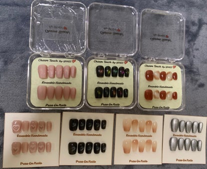 Long length medium size. Handmade Reusable Press On Nails. Comes with nail tool kit (adhesive glue, buffer/nail file, alcohol pads, reusable crystal nail stick dual-end cuticle pusher.